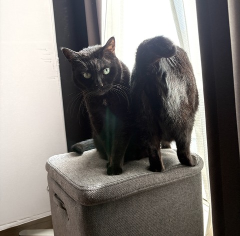 猫たちの人気スポット地味な場所の取り合いをしてます ふたりで落ち着くには狭いスペースアヤちゃんの圧にスミちゃんが出ていってしまいましたでも夜···